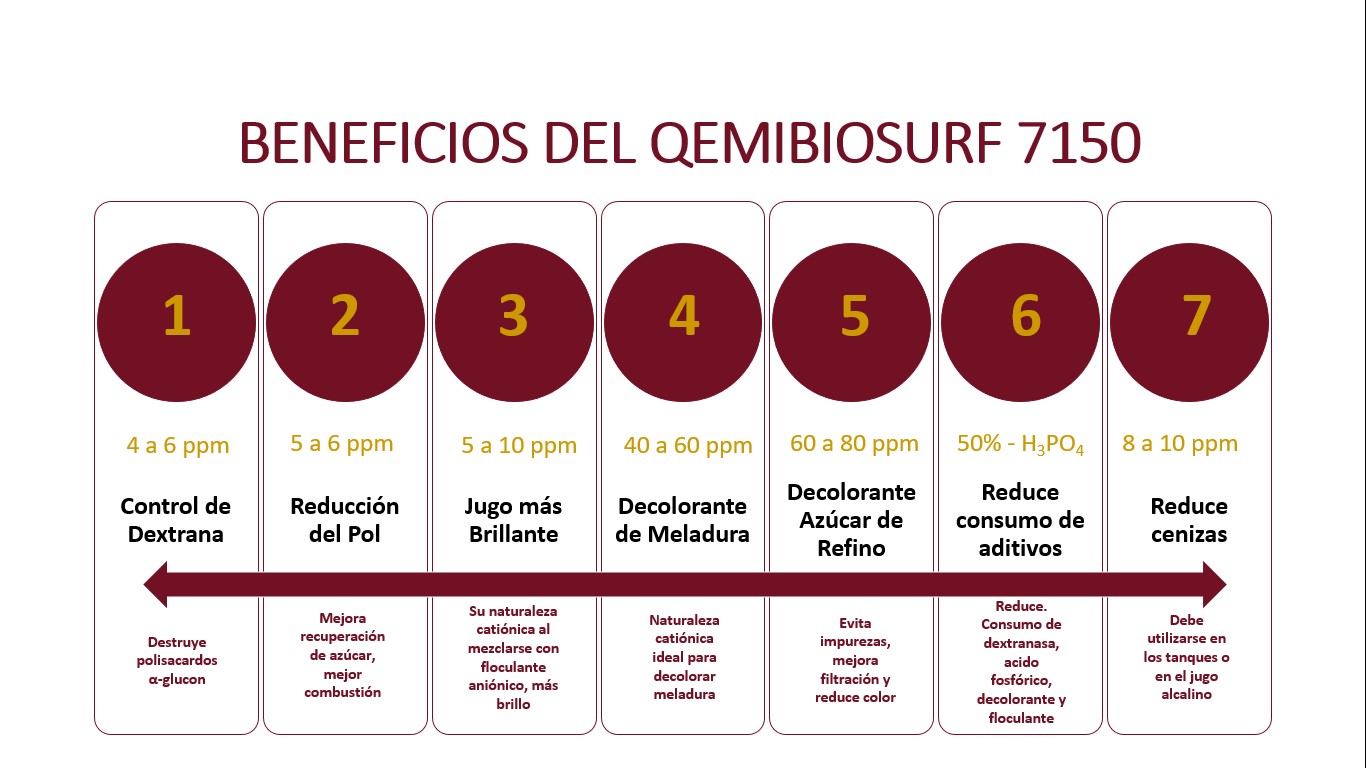 El Qemibiosurf 7150 es un aditivo multifuncional para la industria azucarera. Permite control de dextrana reduciendo la necesidad de dextranasa que es un aditivo costoso en la industria azucarera.Reduce el Pol en el bagazo.En la etapa de clarificación produce un jugo mas brillante y en la etapa de meladura se puede usar como decolorante al igual que en la etapa de producción de azúcar de refino. Reduce el consumo de otros aditivos lo que trae beneficios económicos y ecológicos al tener que usar menos químicos en el proceso.
